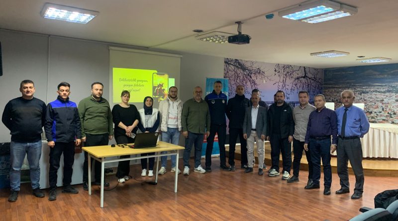 Belediye toplantı salonunda yapılan eğitimde, çalışanların olası yangın risklerine karşı bilinçlenmesi ve doğru müdahale reflekslerinin geliştirilmesi amaçlandı.