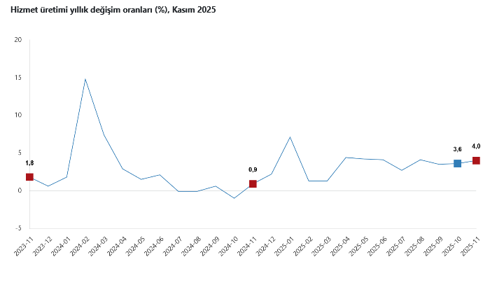 Türkiye İstatistik Kurumu’nun (TÜİK) verilerine göre, hizmet üretim endeksi, Kasım'da yıllık bazda yüzde 4,0 arttı. Aynı ayda ulaştırma ve depolama hizmetleri yüzde 1,6, konaklama ve yiyecek hizmetleri yüzde 7,2, bilgi ve iletişim hizmetleri yüzde 8,7, gayrimenkul hizmetleri yüzde 3,0, mesleki, bilimsel ve teknik hizmetler yüzde 1,7, idari ve destek hizmetleri ise yüzde 5,1 arttı.