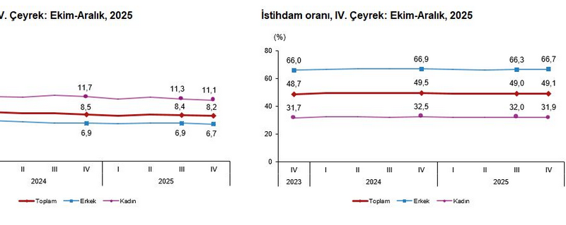İstihdam edilenlerin sayısı 2025 yılı IV. çeyreğinde bir önceki çeyreğe göre 136 bin kişi artarak 32 milyon 686 bin kişi, istihdam oranı ise 0,1 puanlık artış ile yüzde 49,1 oldu. Bu oran erkeklerde yüzde 66,7 iken kadınlarda yüzde 31,9 olarak gerçekleşti.