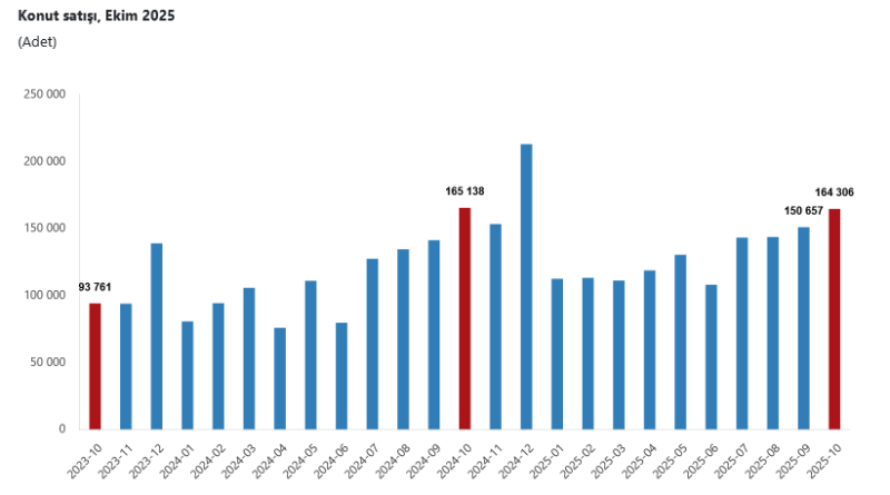 Türkiye İstatistik Kurumu’nun (TÜİK) verilerine göre, Türkiye genelinde konut satışları Ekim ayında bir önceki yılın aynı ayına göre yüzde 0,5 oranında azalarak 164 bin 306 oldu. Konut satış sayısının en fazla olduğu iller sırasıyla 26 bin 305 ile İstanbul, 14 bin 681 ile Ankara ve 8 bin 678 ile İzmir olurken, en az olduğu iller sırasıyla 86 ile Ardahan, 135 ile Bayburt ve 143 ile Tunceli olarak gerçekleşti.