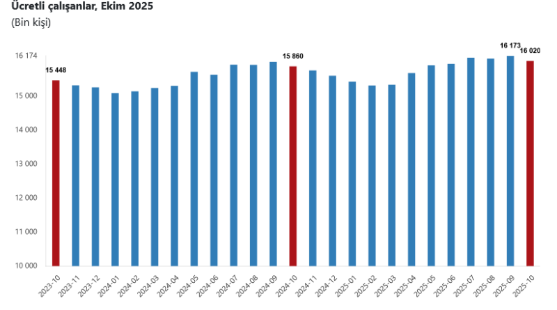 Türkiye İstatistik Kurumu’nun (TÜİK) verilerine göre, sanayi, inşaat ve ticaret-hizmet sektörleri toplamında ücretli çalışan sayısı 2025 Ekim ayında bir önceki yılın aynı ayına göre yüzde 1,0 arttı. Ücretli çalışan sayısı bir önceki yılın aynı ayında 15 milyon 860 bin 31 kişi iken, 2025 yılı Ekim ayında 16 milyon 20 bin 394 kişi oldu.